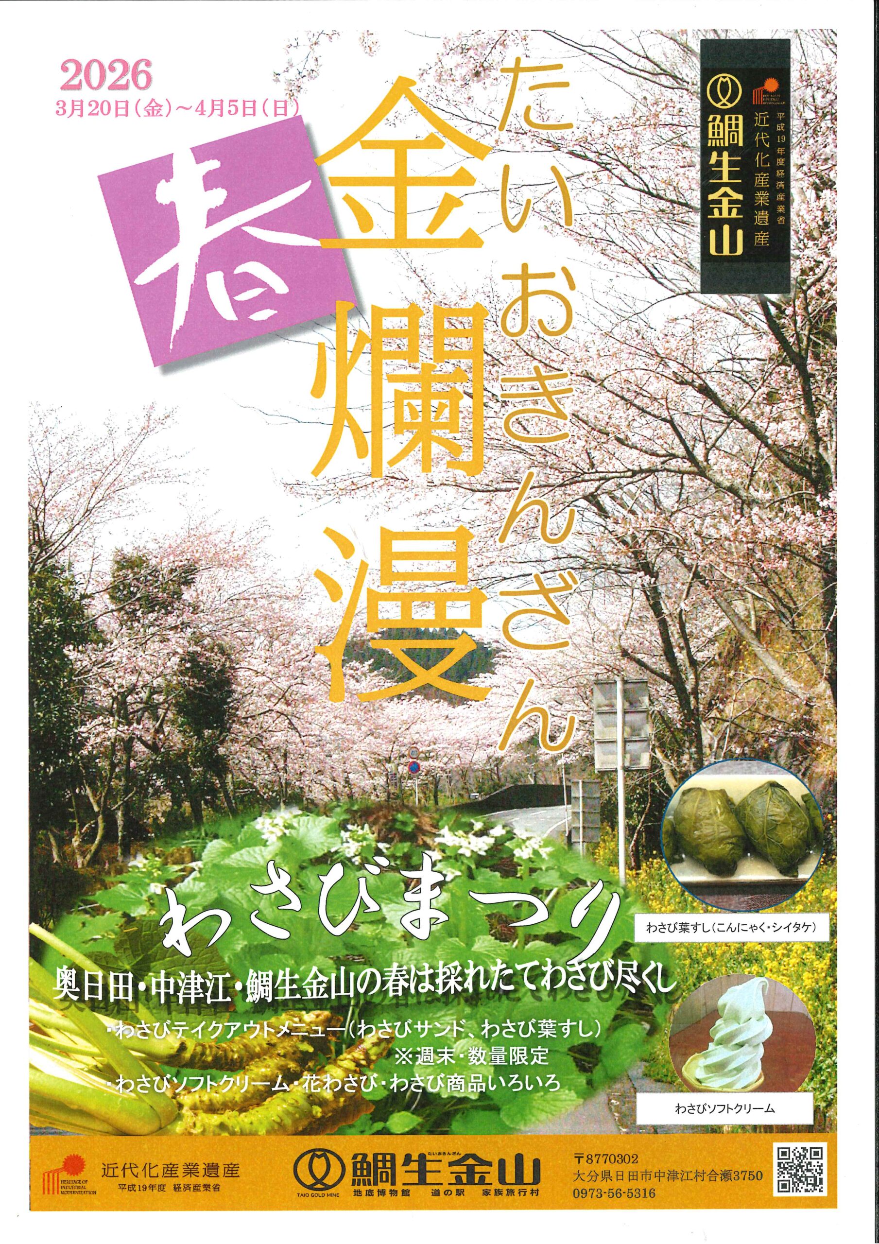 「わさびまつり」開催のおしらせ 投稿日: 2026年3月16日 投稿者: TAIOKINZANMASTER 3月20日(金)~4月5日(日)今年も「わさびまつり」を開催いたします。 「わさびの葉すし」「わさびサンド」「わさびソフトクリーム」他わさび関連商品を取り揃えてお待ちしております。